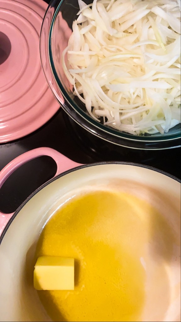 Step 1: Using a soup pot or dutch oven, melt the 3 tbsp of butter and 1 tbsp of oil over medium low heat until the butter is melted. Once melted, turn the temperature to low (a notch above the lowest setting), and then add your onions and stir to coat the onions in the butter mixture. Cover the pot, and let the onions steep for 15 minutes.