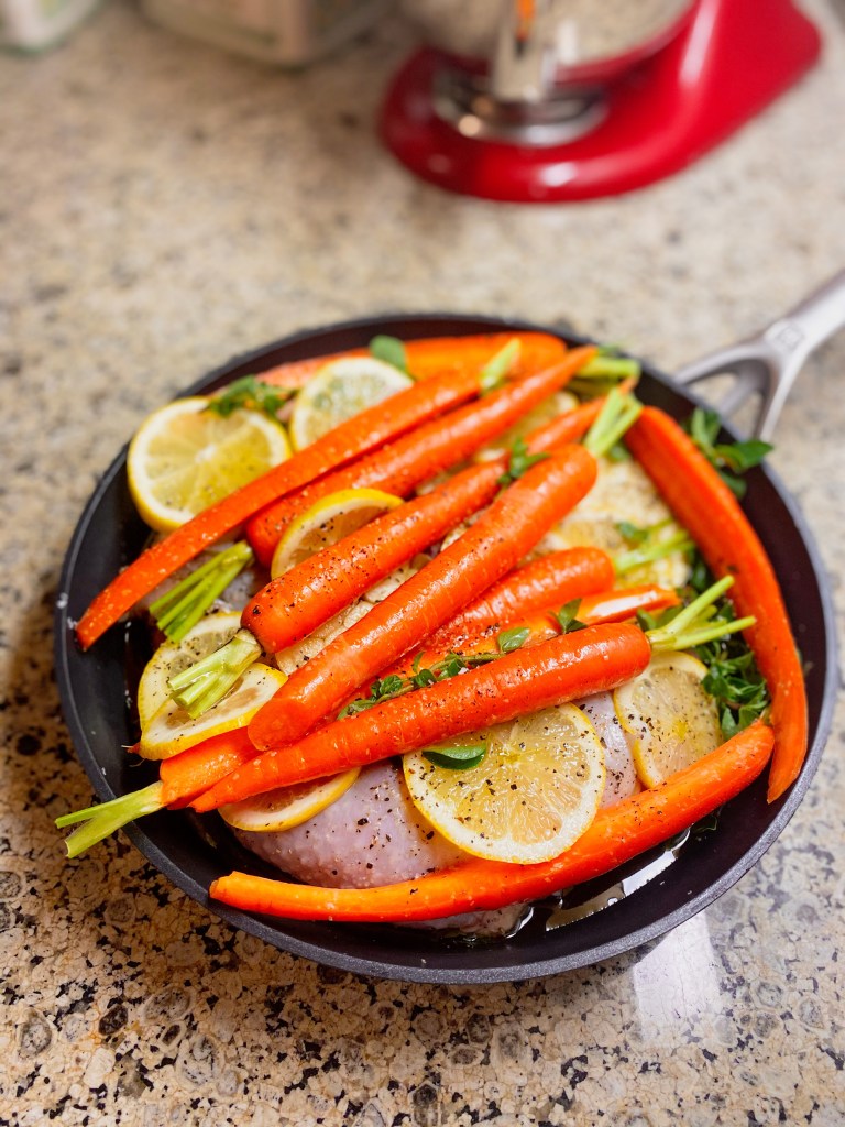This is a delicious chicken dish that looks much fancier than it really is. With just five other ingredients – olive oil, garlic, oregano, lemon, and carrots – the oven does all the work for you. The simplicity of using just a few produce items, mostly kept whole, makes the dish look vibrant, colorful and organic. Great food does not need to be fussy. In fact, the less fussy it is, the more the individual ingredients can shine and give off that true farm-to-table experience everyone craves. This is one of my favorite chicken dishes to make for that reason, and I hope it becomes one of yours too.