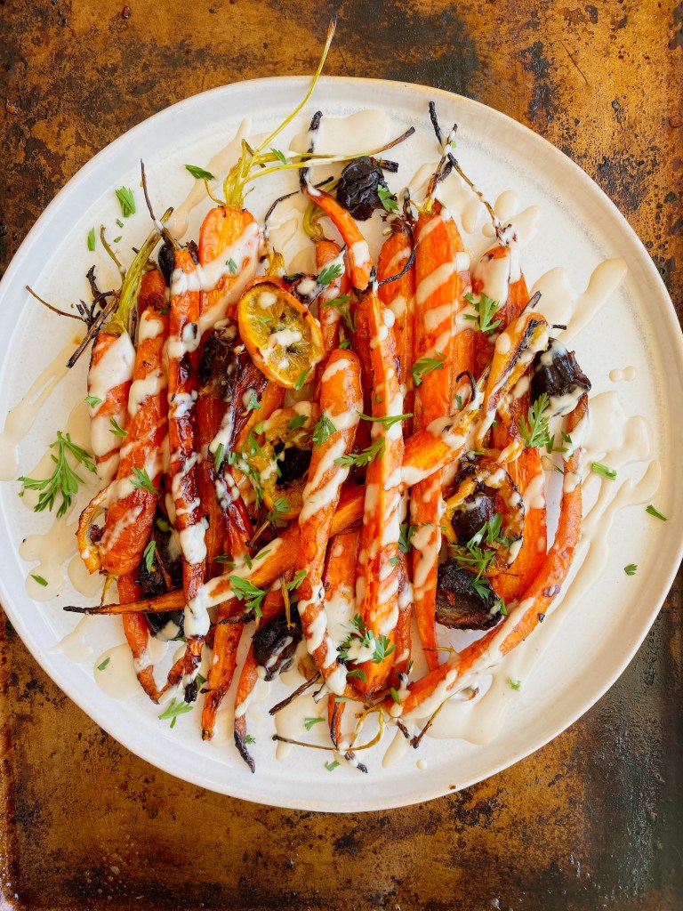 Step 4: Once the carrots, lemons, and dates are finished roasting, plate them, and drizzle everything with the tahini sauce using a spoon. Top with carrot top fronds or other herb (if using). Serve with any extra tahini sauce on the side.