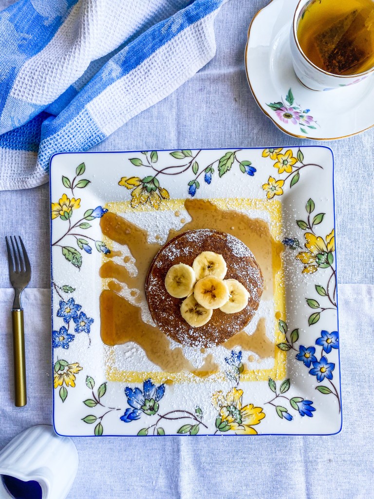Step 5: Stack the pancakes, and top with sliced bananas from the reserved banana. Serve with powdered sugar, maple syrup, or lavender syrup*.