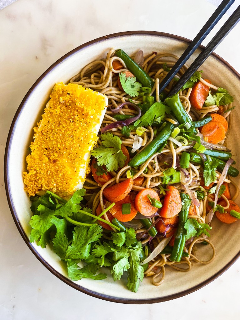 For when you want something clean and healthy, but still filling and nourishing. This dish is adaptable to whatever vegetables you have on hand. The vegetables are just cooked enough so they retain a bit of a bite, contrasting in texture with the soft soba noodles. Everything is tossed in a flavor bomb of a dressing made with soy sauce, ginger, lime, and garlic. Tofu is encrusted with cornmeal or corn grits, which is then lightly fried, and provides a delicious side of protein to make it a complete meal.