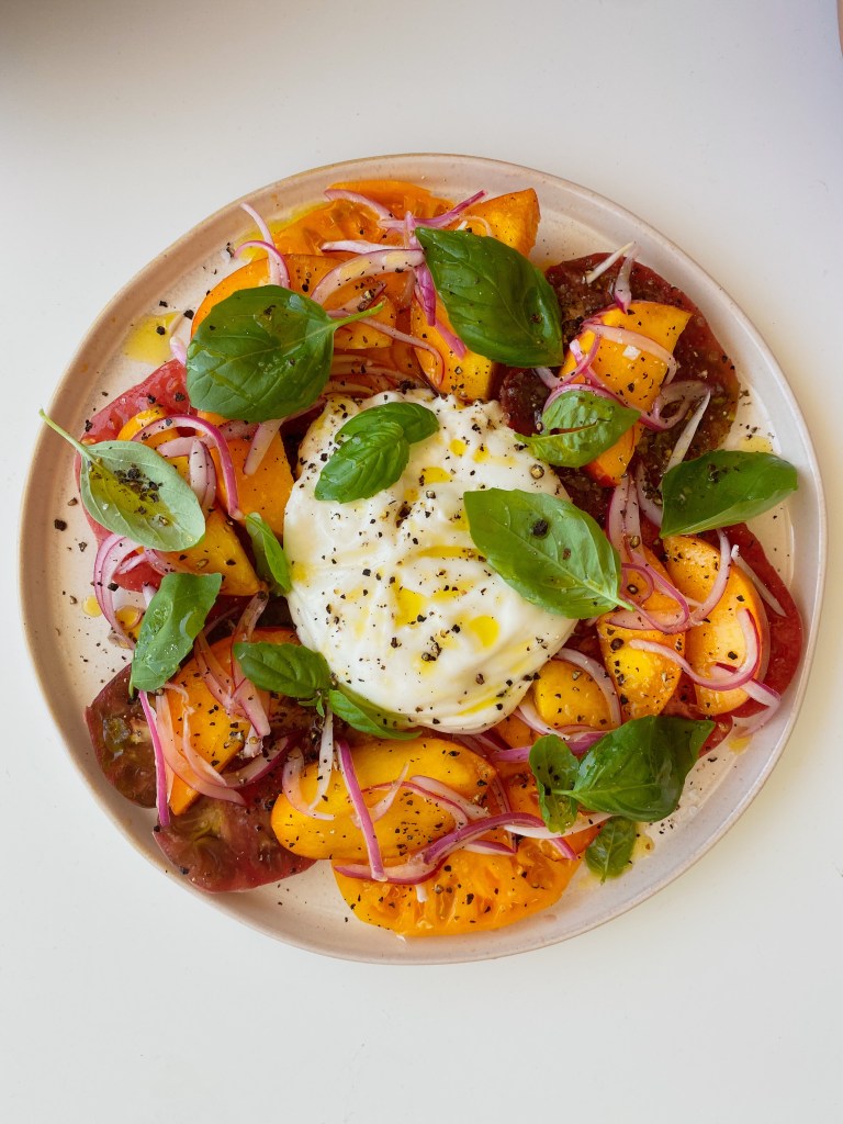 2. Place the burrata (or fresh mozzarella) in the center of a big plate or platter. Arrange the tomatoes around the burrata, followed by the peaches and picked red onions. Throw the basil leaves on top . Season the entire thing with a good amount of kosher or flaky sea salt and freshly cracked pepper. Finish by drizzling a good amount of your best extra-virgin olive oil.