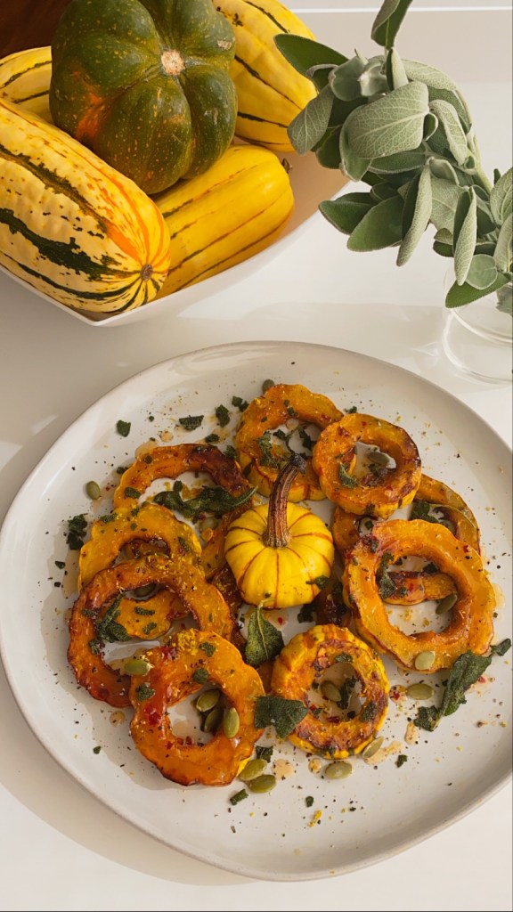 May I introduce the delicata squash for your consideration….I love a butternut squash as much as the next gal, but by the time I’ve cut through the skin and peeled that big guy, I’ve gone through all the levels of knife-handling anxiety. Not the case with the delicata squash. Razor thin skin means I don’t have to fuss with peeling it and can roast it with the skin on. It’s crispy on the outside and creamy on the inside. The shape of the squash when cut is also beautiful, almost flower-like, and makes a beautiful presentation without having to do much. Roast with sage to give it that herby fall flavor, and a good drizzle of honey and olive oil to enhance its natural sweetness.