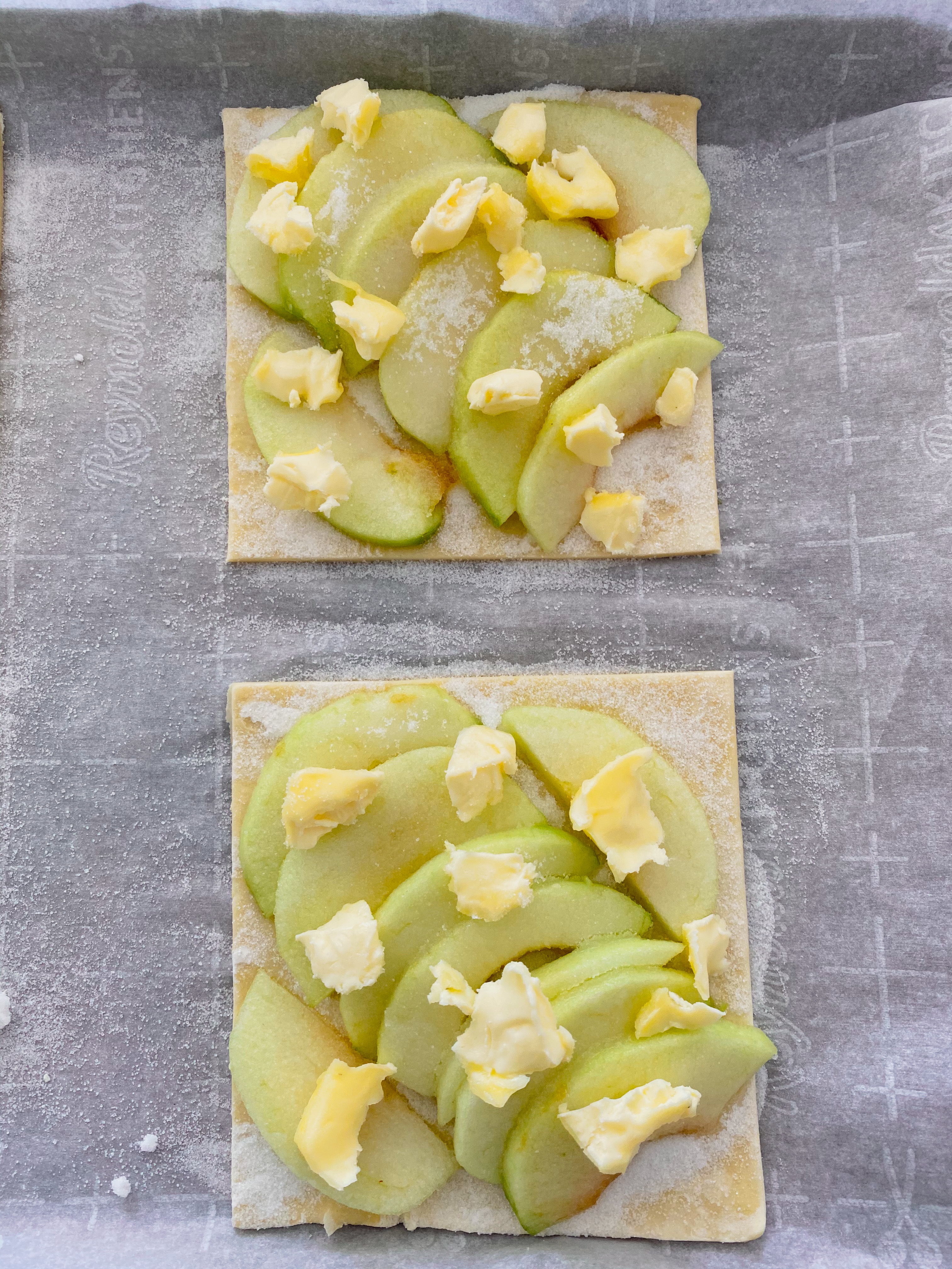 2. Cut the sheet of puff pastry into four squares. Arrange the apple slices diagonally in the center of each square overlapping each other, and fill the remaining spots on the sides with an apple slice. Sprinkle the sugar all over the apples and dot each pastry with the butter. Bake for 30 minutes, until the pastry and edges of the apples start to brown. Remove from oven and place on a cooling rack.